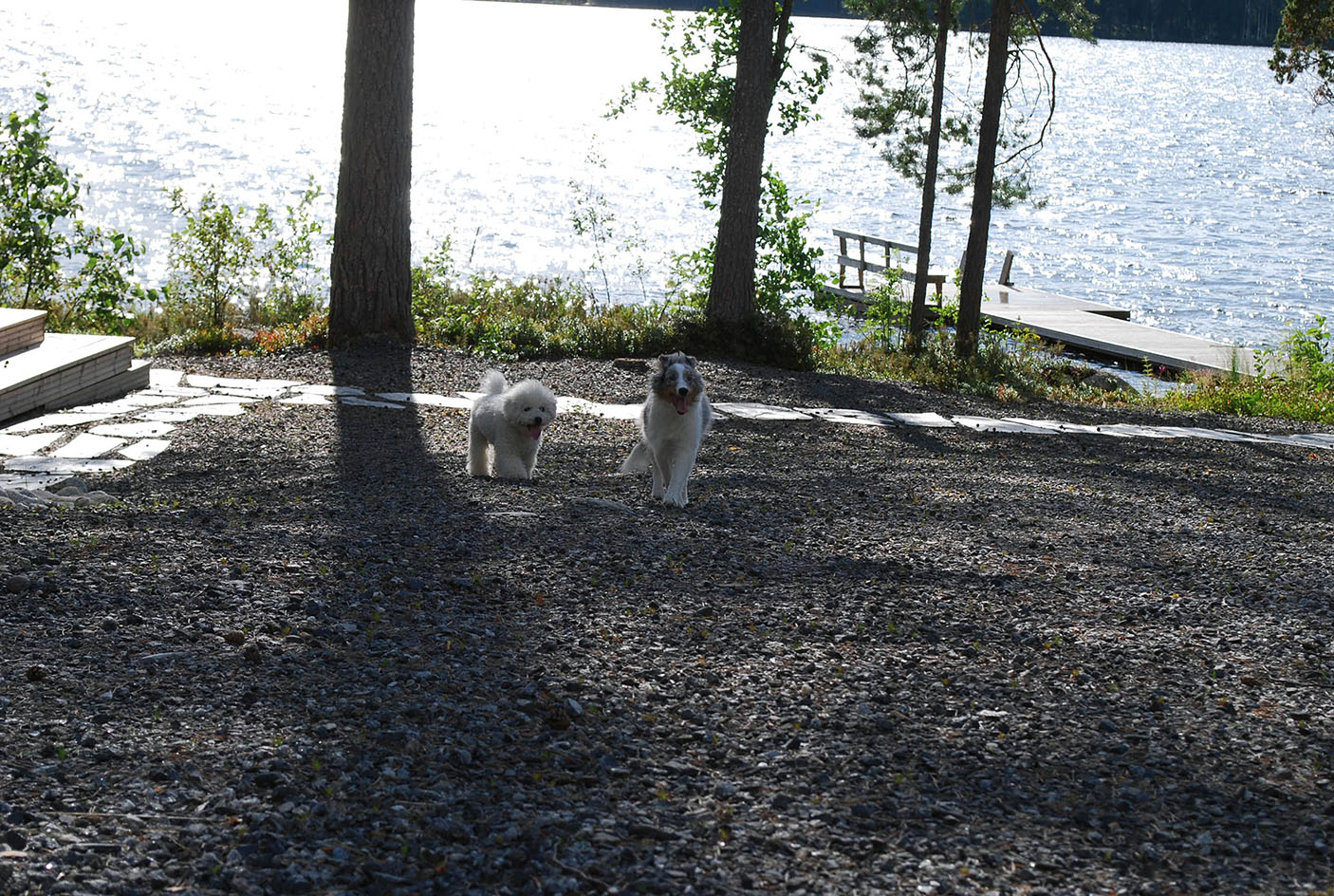 Joka tapauksessa, ollaan saatu kerätä mustikoita ja vadelmia suoraan pensaista suuhun. Pari kanttarelliakin bongattiin ja jätettiin kasvamaan isommaksi. Siskonlampaat bichonit ovat täällä vielä huomiseen ja silloin loppuukin Setin eristäminen. Seti siis ei tule toimeen noiden kahden kanssa, mutta onneksi Nefer saa leikittää ja paimentaa noita kahta.
