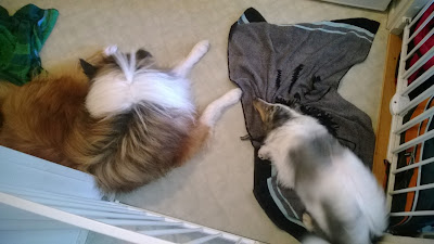 Tämän päivän aamuohjelmaan kuului koirien peseminen anti-shedding shampoolla. Setille sen nyt oikeastaan vain tarvitsi kun karva alkaa vaihtua (irroittaa pohjavillaa kivasti, joten turkin vaihtuminen sujuu nopeammin), mutta päätin vetää pesulinjastolla Neferin myös, että olisi edes yksi kokopesukokemus. Aikaisemmin on pesty vain takamus ja tassut. Hyvin tuo antoi pestä, muutaman kerran yritti karkuun, mutta ymmärsi jutun juonen nopeasti. Pyyhekuivauksen jälkeen alkoikin ralli ja pään hinkkaaminen pyyhkeisiin karsinassa.